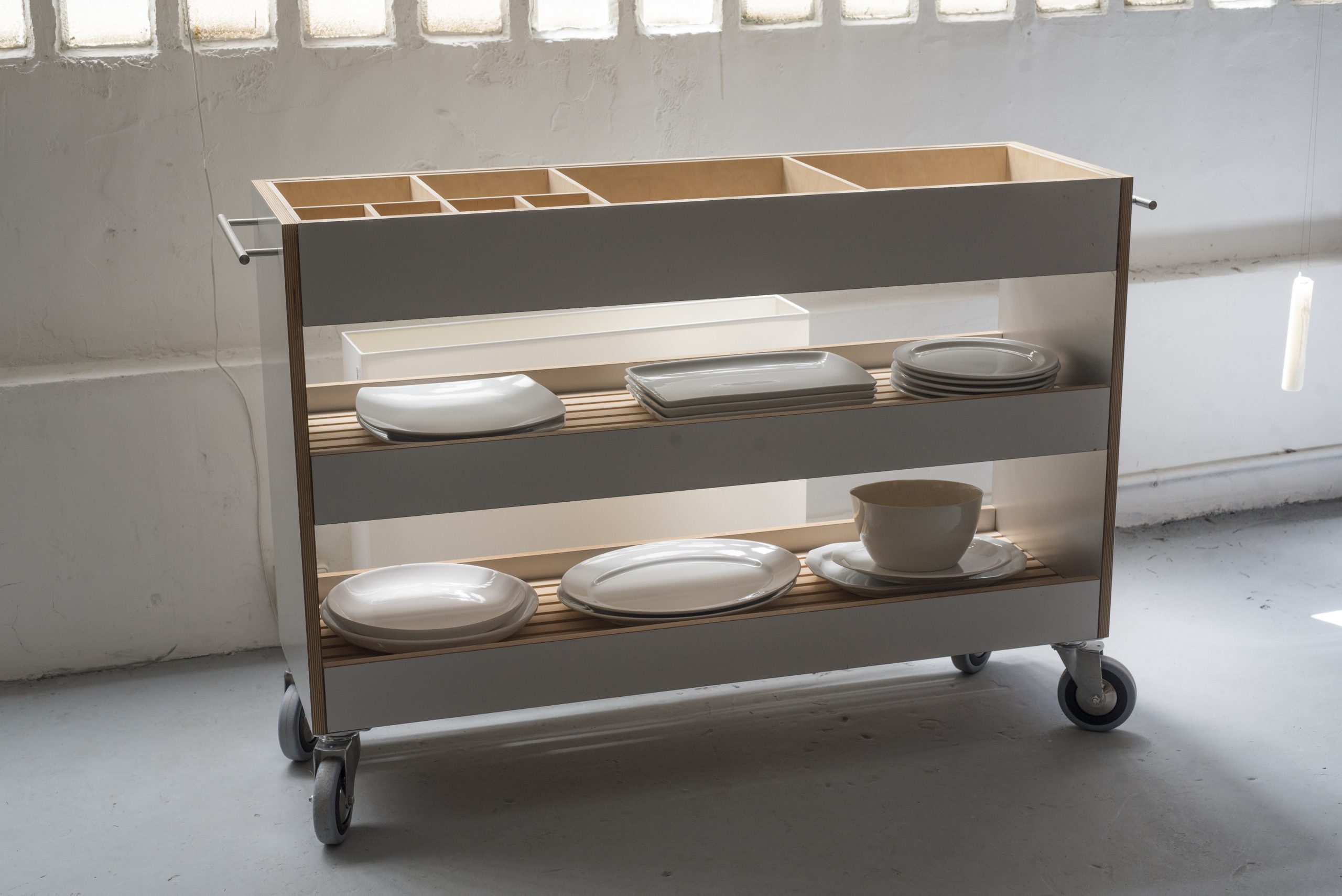 Las formas geométricas puras, suponen un trabajo de síntesis para reducir la arquitectura a ellas. El carro auxiliar Doméstica es un ejemplo de ello; dotado de una riqueza formal y material tan precisa como atractiva, forma parte de un complejo sistema de mobiliario modular, diseñado y desarrollado por Pilar Blanco en el Estudio Imatra a finales de los años 80.